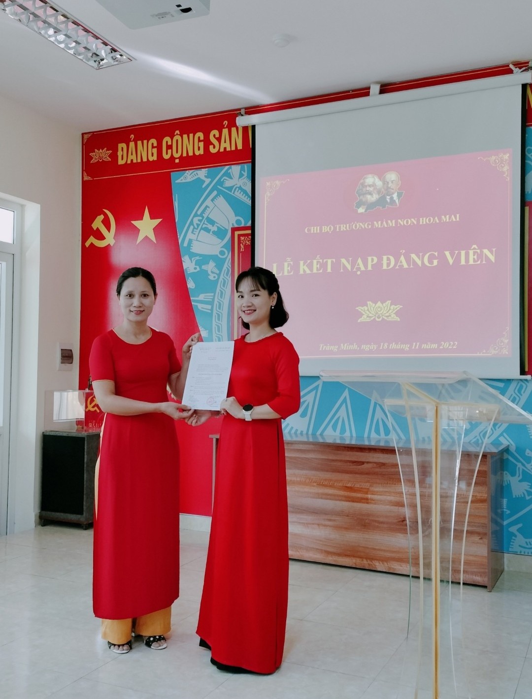 Hôm nay, ngày 18 tháng 11 năm 2022 Chi bộ trường Mầm non Hoa Mai tổ chức lễ kết nạp Đảng viên cho quần chúng Vũ Thị Duyên.