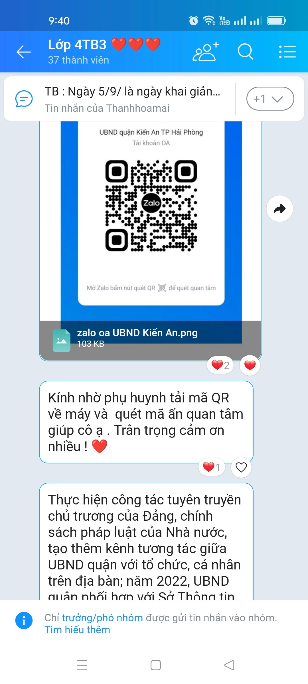 Tuyên truyền đến các phụ huynh học sinh trong nhà trường về nội dung trang Zalo OA “UBND quận Kiến An TP Hải Phòng” thông qua quét mã QR tại góc tuyên truyền và đăng tải trong nhóm zalo các lớp để đông đảo phụ huynh học sinh biết và theo dõi: