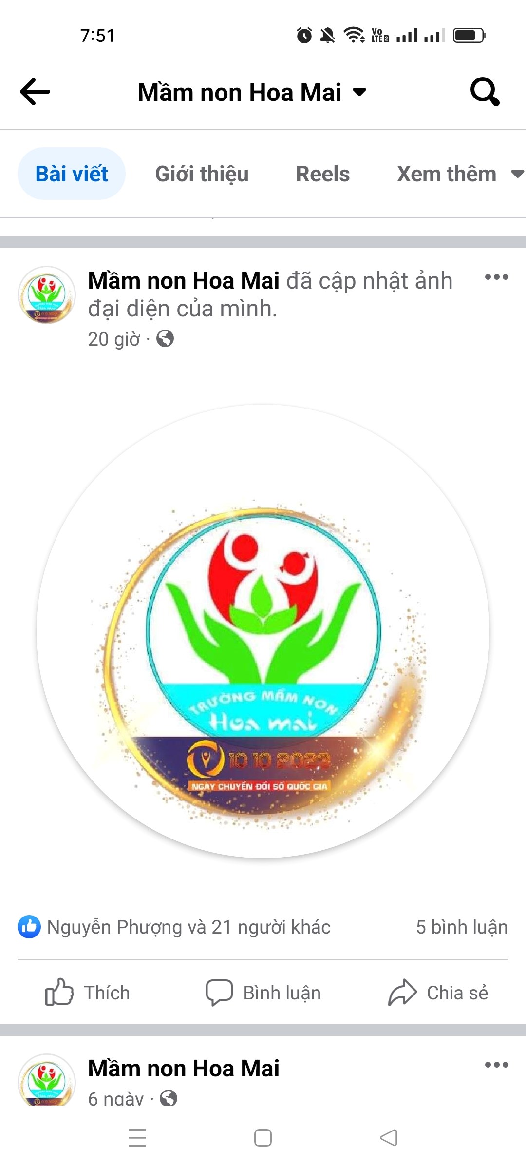 Thực hiện Công văn số 2658/SGDĐT-VP Hải Phòng, ngày 27 tháng 9 năm 2023 về việc phổ cập bộ nhận diện Ngày Chuyển đổi số quốc gia năm 2023,Trường Mầm non Hoa Mai đã tích cực hưởng ứng Ngày chuyển đổi số quốc gia năm 2023 vào trong công tác quản lý và dạy học nhằm hướng đến " Chuyển đổi số trong giáo dục- Xây dựng giáo dục thông minh" đáp ứng nhu cầu phát triển của toàn xã hội, đưa giáo dục nhà trường ngày một vươn xa.