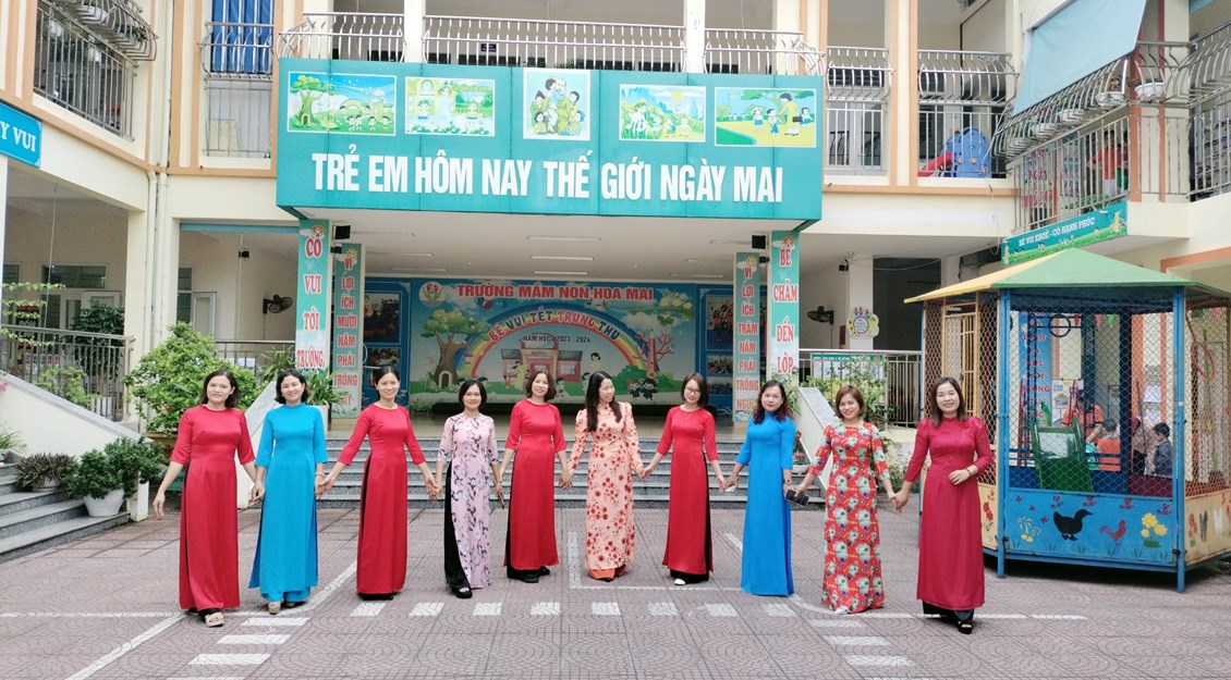 Thực hiện Công văn số 14/LĐLĐ ngày 09/10/2023 của Liên đoàn Lao động quận Kiến An về việc hưởng ứng “Tuần lễ Áo dài Việt Nam”, Chào mừng Đại hội XV Công đoàn Thành phố nhiệm kỳ 2023-2028; Để góp phần lan tỏa việc bảo tồn và phát huy những giá trị tốt đẹp của chiếc áo dài truyền thống của người Việt Nam và hưởng ứng "Tuần lễ áo dài" năm 2023, tập thể CBGV trường Mầm non Hoa Mai cùng nhau mặc những chiếc áo dài xinh xắn nhằm tuyên truyền đến các bậc phụ huynh học sinh vẻ đẹp và ý nghĩa của tà áo dài Việt Nam.