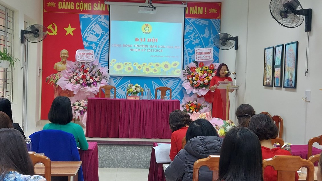 Phát biểu tại Đại hội, đồng chí Đỗ Thị Thư - Chủ tịch công đoàn, phó hiệu trưởng nhà trường đã biểu dương kết quả mà Công đoàn cơ sở Trường Mầm non Hoa Mai đã đạt được trong thời gian qua, đồng thời đề nghị Công đoàn Trường Mầm non Hoa Mai làm tốt hơn nữa công tác giáo dục chính trị tư tưởng cho cán bộ, đoàn viên; thường xuyên chăm lo đời sống vật chất và tinh thần, bảo vệ quyền và lợi ích hợp pháp, chính đáng của đoàn viên, cán bộ viên chức lao động. Phát huy những kết quả đã đạt được, công đoàn cơ sở Trường mầm non Hoa Mai tiếp tục xây dựng và tổ chức hoạt động của Công đoàn ngày càng vững mạnh, thực sự đưa sự nghiệp giáo dục ngày càng đi lên vững chắc.