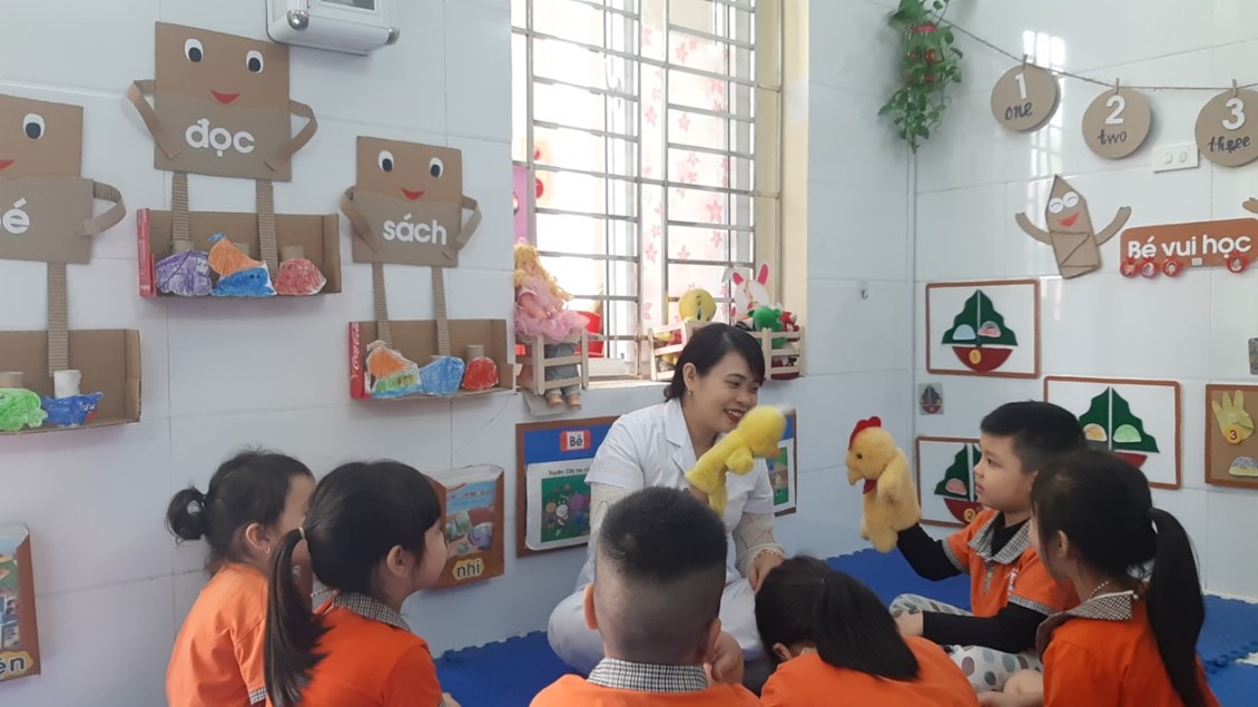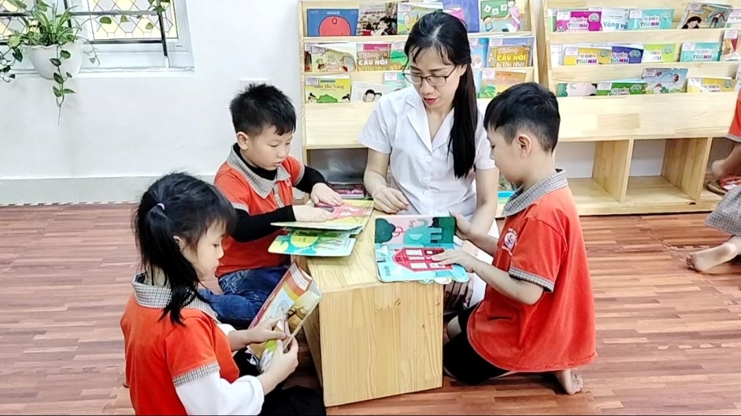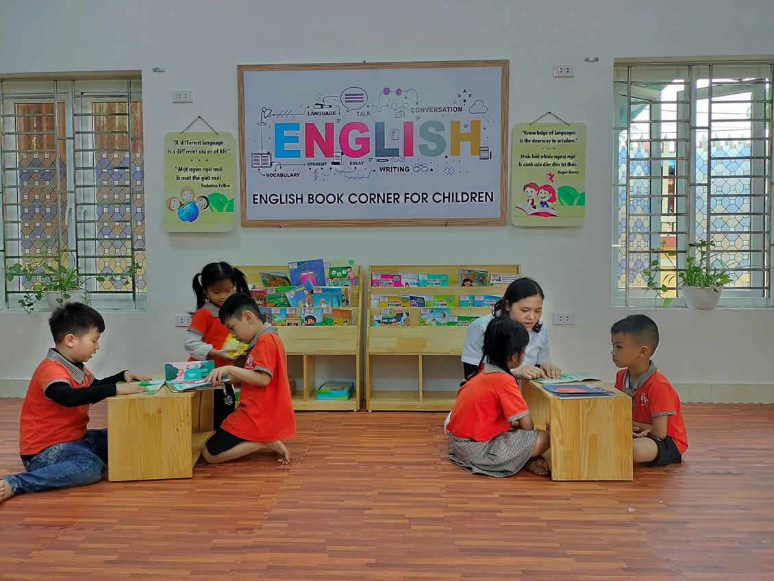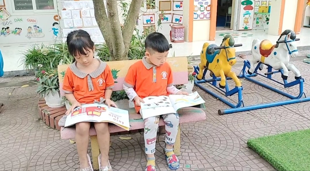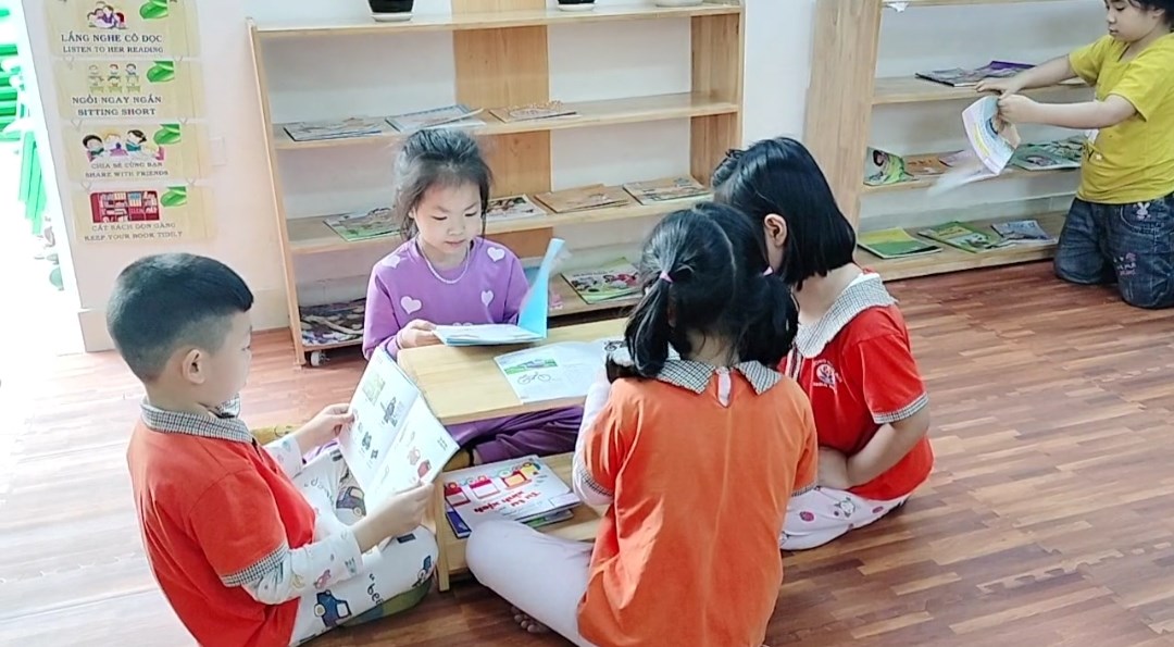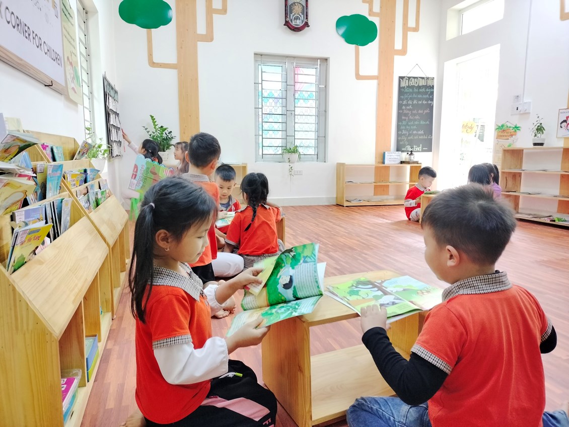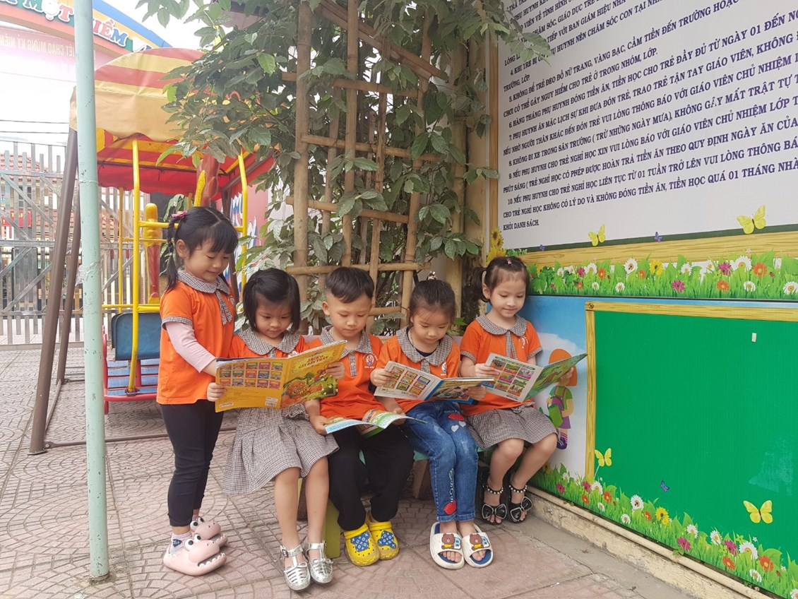 Tại các lớp đều được bố trí các góc sách khoa học và sáng tạo, có tính thẩm mĩ, phù hợp với lứa tuổi hoạt động xem sách và nghe cô kể truyện luôn là hoạt động thường xuyên của nhà trường. Qua đó, trẻ thêm yêu những trang sách, biết được nhiều điều bổ ích từ sách và có kỹ năng thói quen đọc sách, nâng cao văn hoá đọc.
