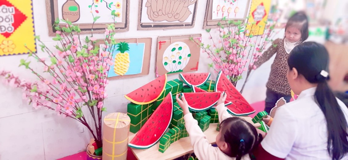 Mỗi dịp Tết đến, xuân về với người lớn là cả một sự hoài niệm “Tết ngày xưa” của mình, thì dường như con trẻ hôm nay đang ít được biết tới những giá trị truyền thống. Với hầu hết trẻ em hôm nay, Tết chỉ đơn giản là thời điểm các em được nghỉ học, nhận lì xì, ăn bánh kẹo và đi chơi xuân.Với mong muốn giữ được những nét đẹp cổ truyền ngày tết dân tộc và sự hội nhập quốc tế qua các hoạt động khám phá trải nghiệm, với chủ đề “Bé vui đón tết”, nhà trường rất mong muốn xây dựng được không gian tràn ngập không khí Tết với hoa đào, hoa mai, bánh chưng xanh, các con được nghe cô kể về ý nghĩa của ngày Tết cổ truyền, sự tích của bánh chưng, bánh dày, hướng dẫn cách gói bánh chưng, bánh đa nem, thư pháp xuân, nghệ thuật làm tò he, hội chợ xuân.... Với sự nhiệt tình ủng hộ của cha mẹ học sinh, sự phối kết hợp chặt chẽ giữa gia đình và nhà trường, các con được tự tay gấp, cắt, xếp lá dong, đồ gạo nếp, cho nhân vào bánh, buộc lạt. Những chiếc bánh do chính các con gói tuy chưa được hoàn hảo, tròn trịa, vuông vắn nhưng chứa đựng sự cố gắng của các con