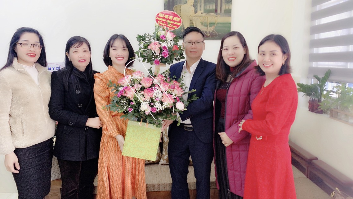 Đ/c Nguyễn Thị Lý - Trạm trưởng y tế phường Tràng Minh đến chúc mừng và tặng hoa nhà trường