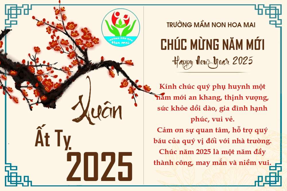 Trong không khí náo nức, tươi vui của một mùa Xuân mới, nhân dịp năm mới Ất Tỵ 2025 đang tới gần, Trường Mầm non Hoa Mai xin gửi đến toàn thể Quý Phụ huynh và những gia đình thân thương của các con một năm mới an khang thịnh vượng, giữ chặt lộc tài, hưởng trọn bình an, cùng nhau sung túc.