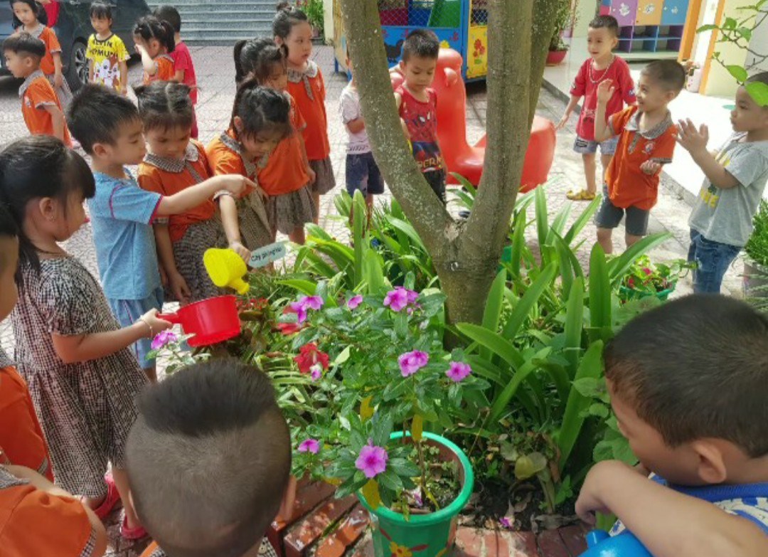Bé rửa tay sạch sau hoạt động chăm sóc cây