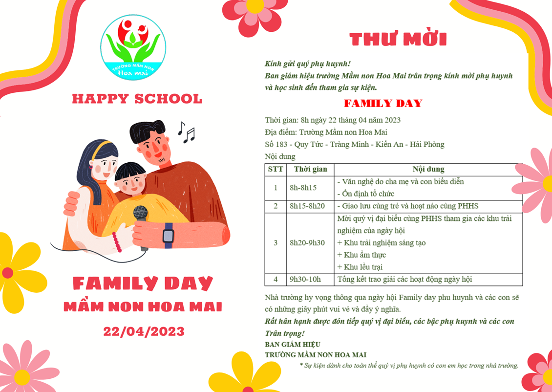 Ban Giám Hiệu Trường mầm non Hoa Mai trân trọng kính mời phụ huynh và các bạn học sinh đến tham gia sự kiện Ngày hội Family day của trường Mầm non Hoa Mai.