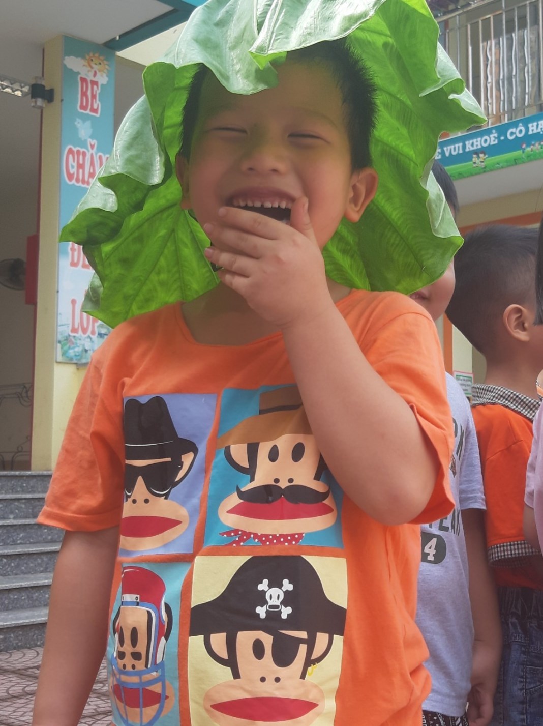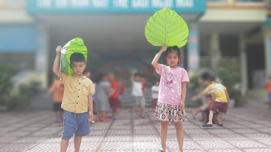 Bé tạo dáng với lá dọc mùng cũng chuyên nghiệp như người mẫu
